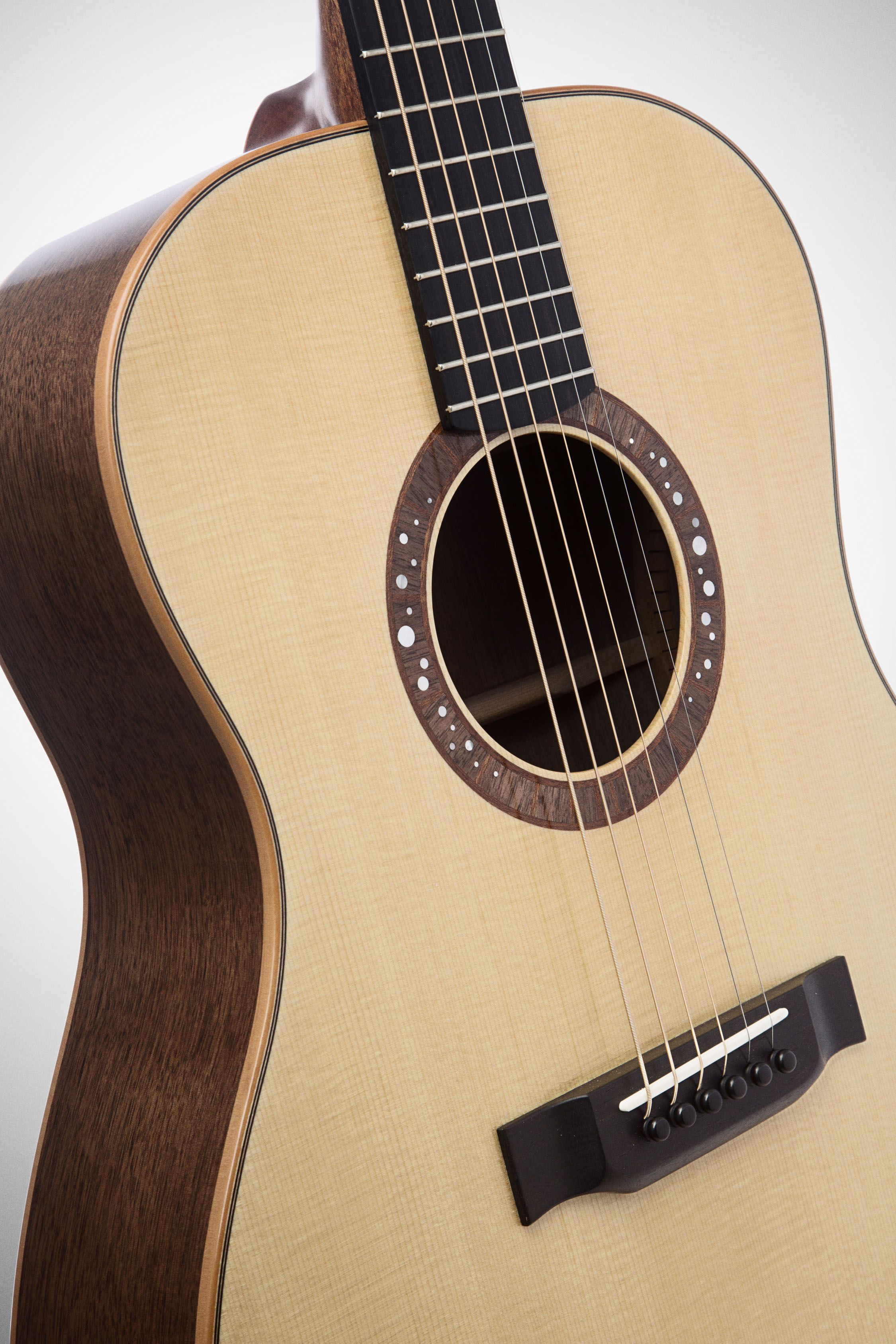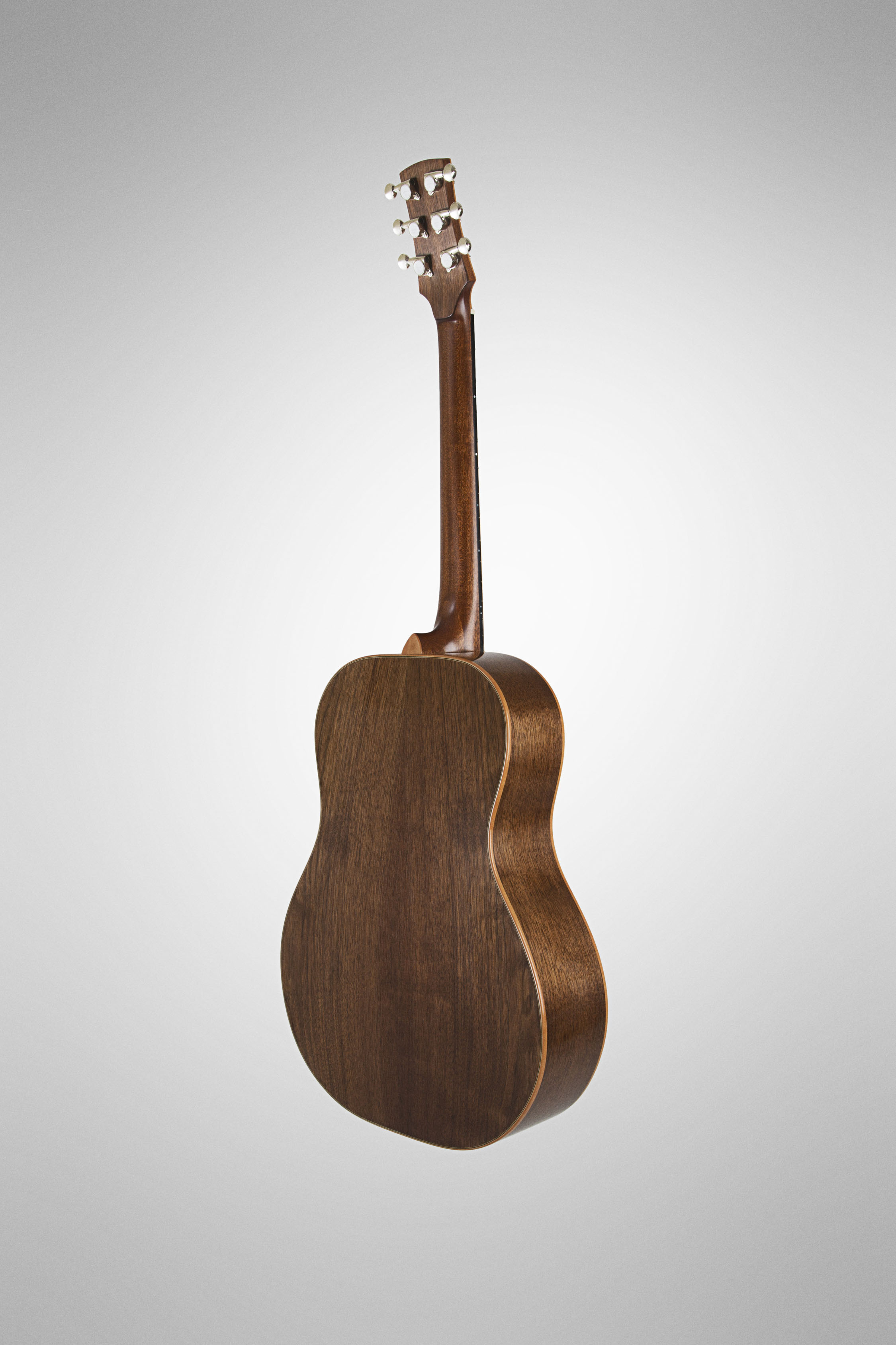 This OM-style steel string guitar has an Alaskan Sitka Spruce top, Black Walnut back and sides, Sapele neck, pear wood binding and ebony fingerboard and bridge. The scale length is 25.5" producing a fairly loud instrument balanced from treble to bass. The rosette of this otherwise unadorned guitar is inlaid with mother-of-pearl dots. Hand applied oil varnish finish.