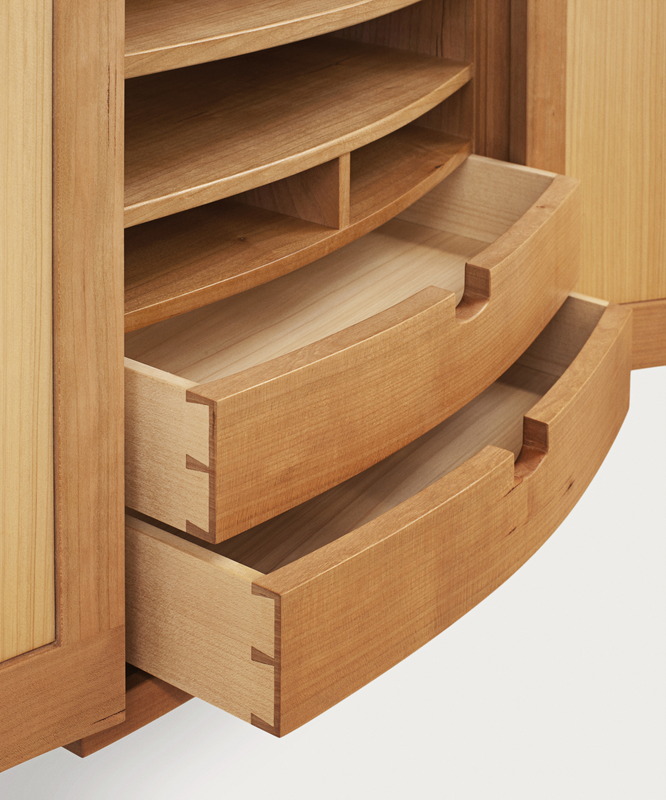 This wall cabinet incorporates hand-cut dovetails, curved frame and panels doors, and curved shoji panel windows. The interior drawer box is removable and can function as its own separate piece of furniture, so technically speaking, this one's a twofer. As for the curved shoji panels, those are exceedingly rare, so maybe this cabinet is more of a threefer.