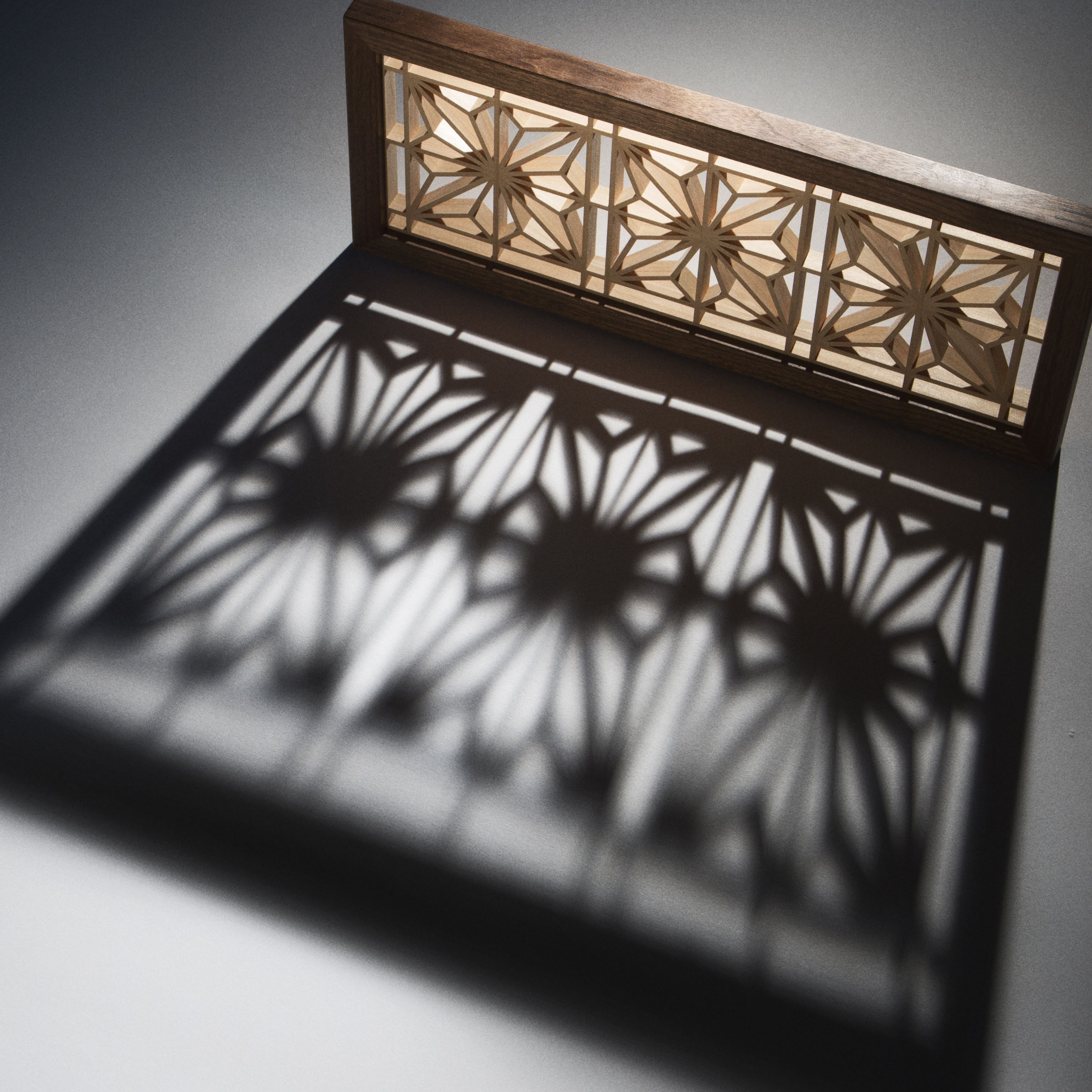 These pieces display two versions of the familiar asa-no-ha kumiko pattern. They're purely decorative here, but this kind of work is also excellent for doors, panels, and room dividers. The frames have mitered spline construction, a technique often used on picture frames.